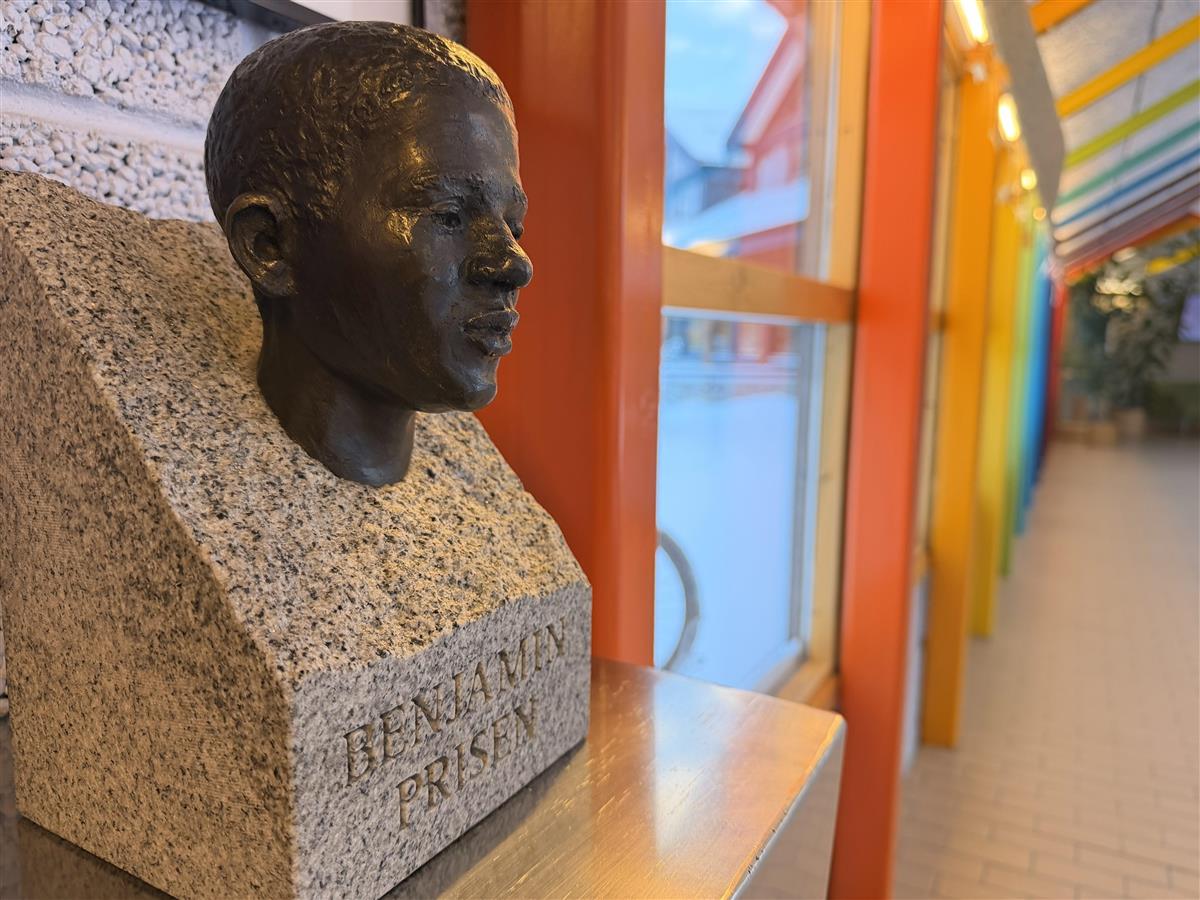 Statuen av Benjamin har en sentral plass i skolens inngangsparti